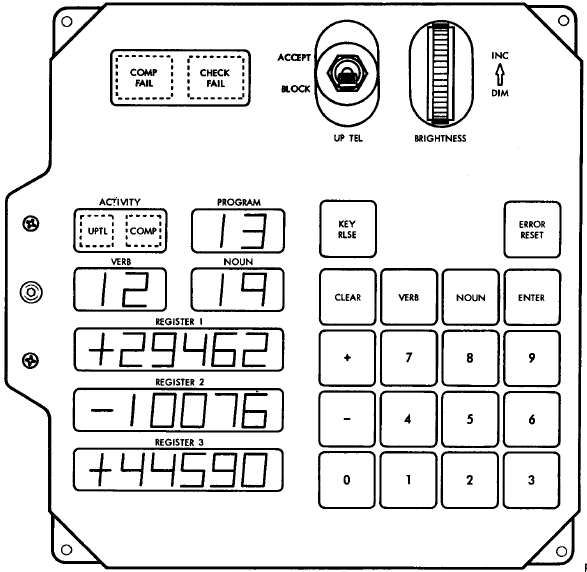 Aside: Curiously, the "upload" indicator lamp is everywhere marked as "UPTL". By everywhere, I mean both in the photographs of the physical DSKYs and in the line drawings. Whereas to my way of thinking, it's transparently obvious that "UPLD" would be a more-sensible marking. Perhaps it's short for "UPward Telemetry Link" or something of that nature.From our (or perhaps my) standpoint, the most-important characteristic of the DSKY is that it is a very dumb device, in the sense that it is close to being just a set of lights and push-buttons connected directly to electrical outputs and input of the AGC. This is not entirely true, since there would simply be too many such signals if each were provided with it's own dedicated wire, so some of the signals are multiplexed together, latched into internal relays provided by the DSKY.