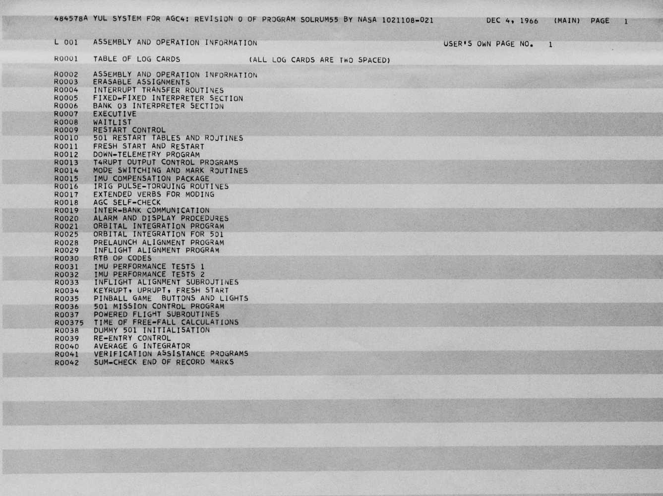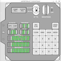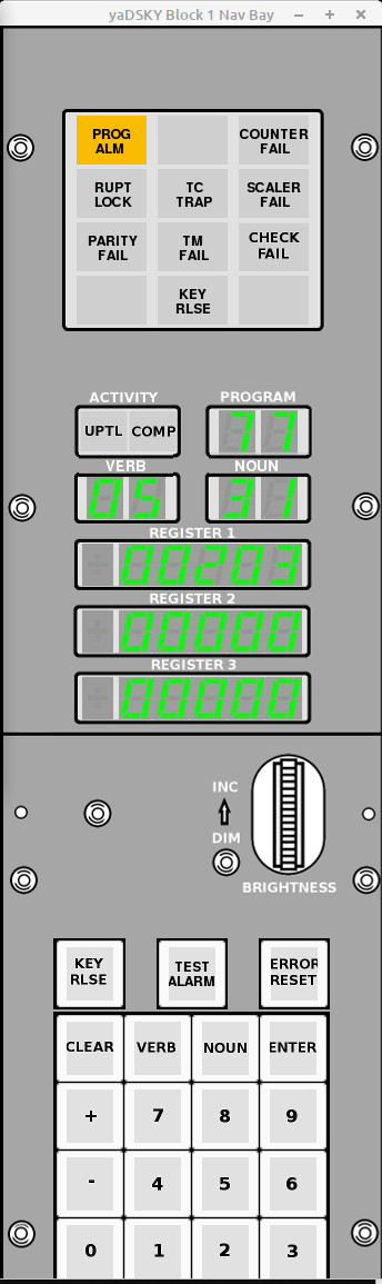 enough to take a screenshot of it. At first, it will really show "PROGRAM 00" rather than "PROGRAM 77", because the AGC is in "major mode" 00. What has happened, however, is that on power-up the AGC hasn't been able to detect any Inertial Measurement Unit (IMU), because we don't have a simulation for one hooked up to it! Detecting this condition, a specific AGC program called the "Night Watchman" has detected this condition and decided to flip over to major mode 77 ... which isn't documented, as far as I can tell, and none of the original AGC developers I've contacted remember it, including Jim Kernan, who was Solarium's "rope mother". Of the other items displayed, "VERB 05" is an "octal display of data" while "NOUN 31" indicates that the data being displayed is "Failreg", the failure register. The 5-digit displays, I believe, are the last three error conditions reported, of which only one, 00203 actually has an error code in it. Thus, you are seeing "Alarm 00203". According to the source code, alarm 00203 is "NO IMU MODE INDICATED TO COMPUTER". The IMU mode is communicated to the AGC through its input register IN2, I believe, which is all zeroes at this point, given that there is no IMU, and all zeroes is not recognized as a legitimate IMU mode. |