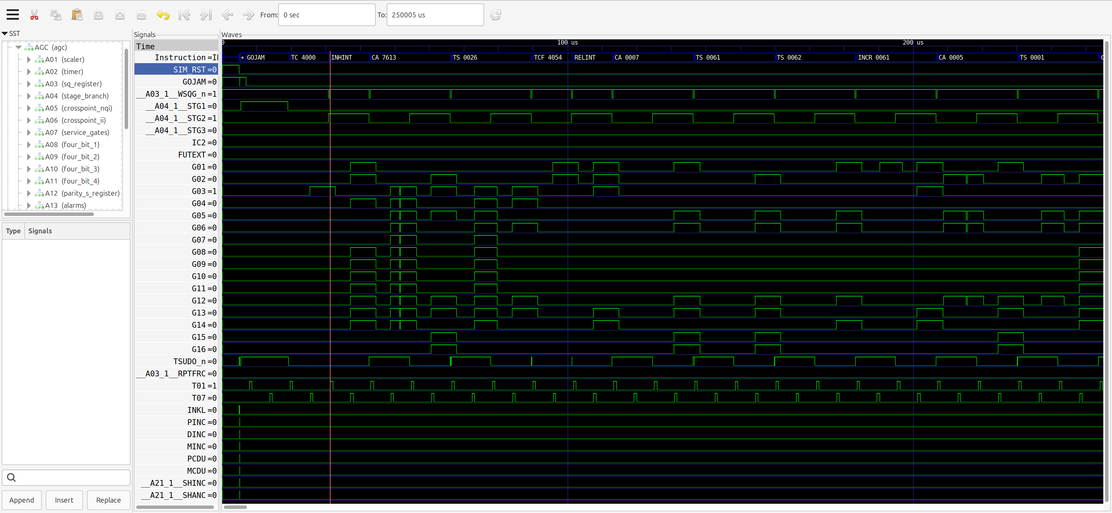 Our workflow uses the iVerilog emulator for this. Typically, this creates a "dump file" of whichever of the AGC's signals were considered to be interesting when the test bench was written. |